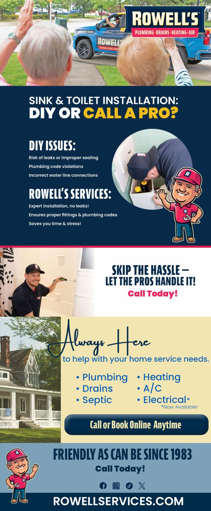 "Friendly As Can Be Since 1983!" When you need help with your plumbing, drains, heating, cooling or electrical in Gilmanton, you can always rely on Rowell's Services! Call us now or book online!